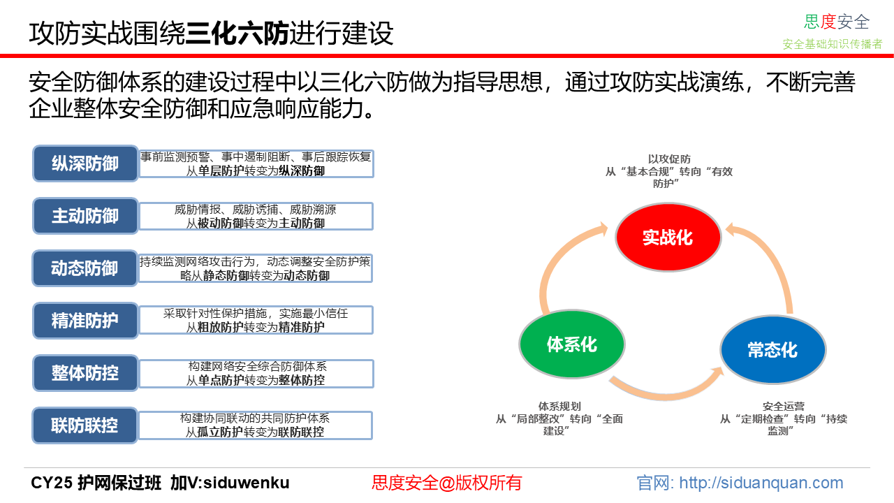 护网是为了检验《贯彻落实网络安全等级保护制度和关键信息基础设施安全保护制度的指导意见》提出的三化六防思想,落实情况。