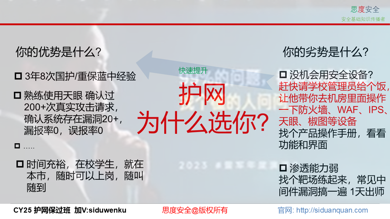 所以面对护网要充分的准备,知道自己的优缺点,哪些缺点可以短时间内提升?