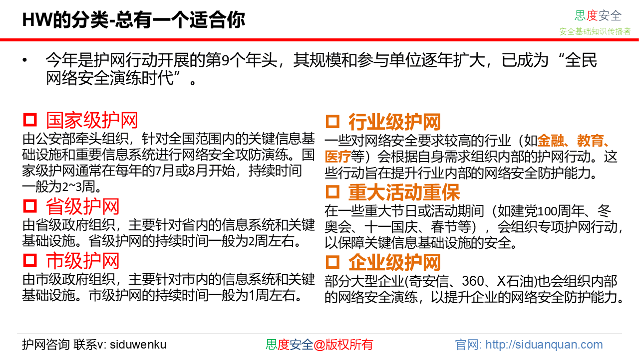 护网就是攻防演练,包括国家级的国护,省级和市级的护网,如上海的磐石行动、北京市护网;还有大型行业内部组织的攻防演练,重大节假日期间的重保服务等。