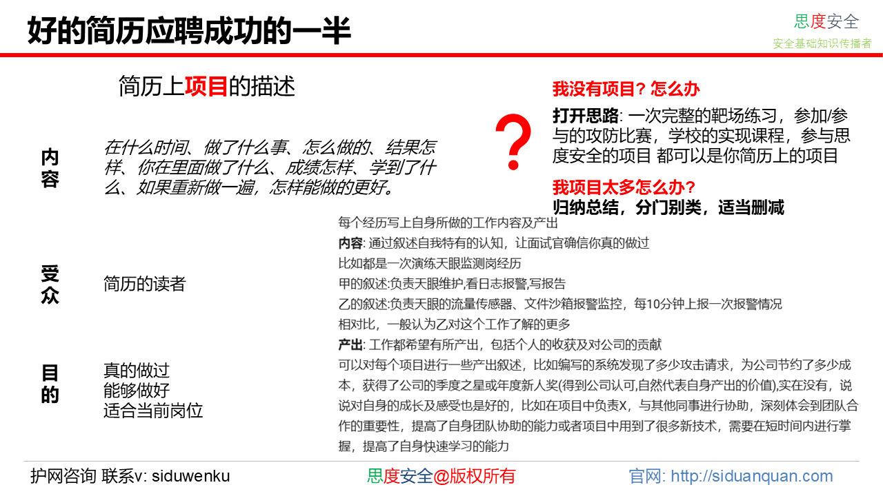 有很多在校学生常问这个问题。 大家要打开思路: 一次完整的靶场练习,参加/参与的攻防比赛,学校的实现课程,参与思度安全的项目 都可以是你简历上的项目。
