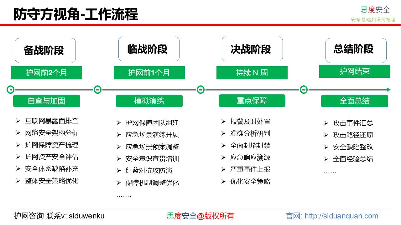 HW本身就是攻防演练,从甲方(防守方的视角),护网前的风险自查,临战期间的模拟演练,决战阶段的7X24小时的坚守,最后的总结 提升防御能力。