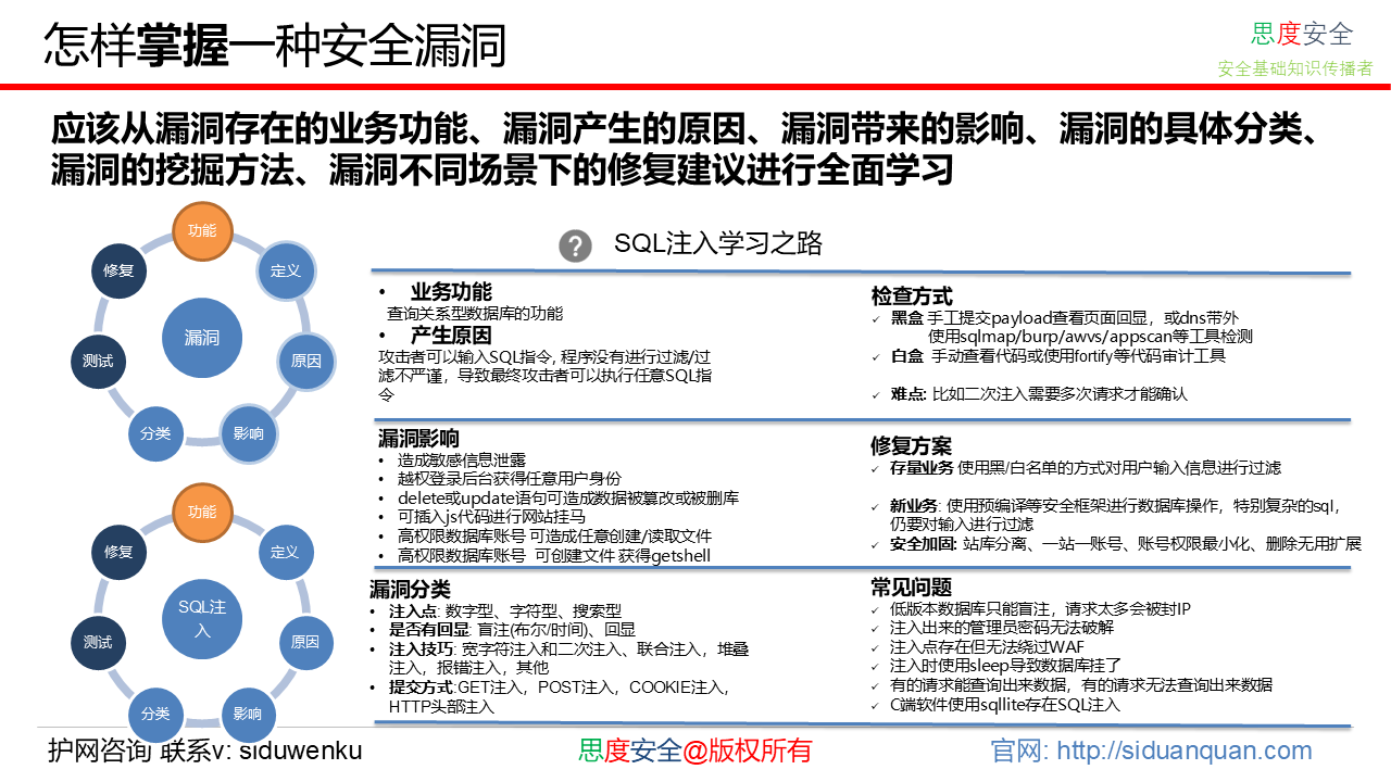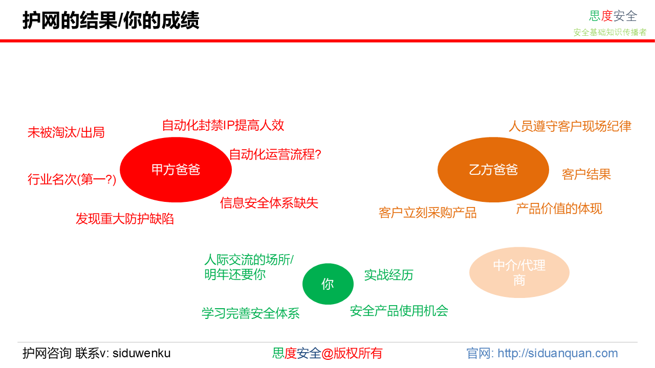 每个问题都是信息安全体系中的一个小点,透过这个小点,应该可以看到它相关的点,点与点就会连接成线,线与线就够成了面,面与面就连成体,点线面体组成了信息安全完整体系。 这里面不仅仅是安全知识,有很多研发、运维、管理、人员等方面的内容,是综合能力的汇聚,力出一孔的体现。 顺便说一下,工作几年之后大家的技术基本上已经达到中级水平,在往上走,核心是要了解等保、27001等安全体系,同时要了解业务、系统等他方面的内容。