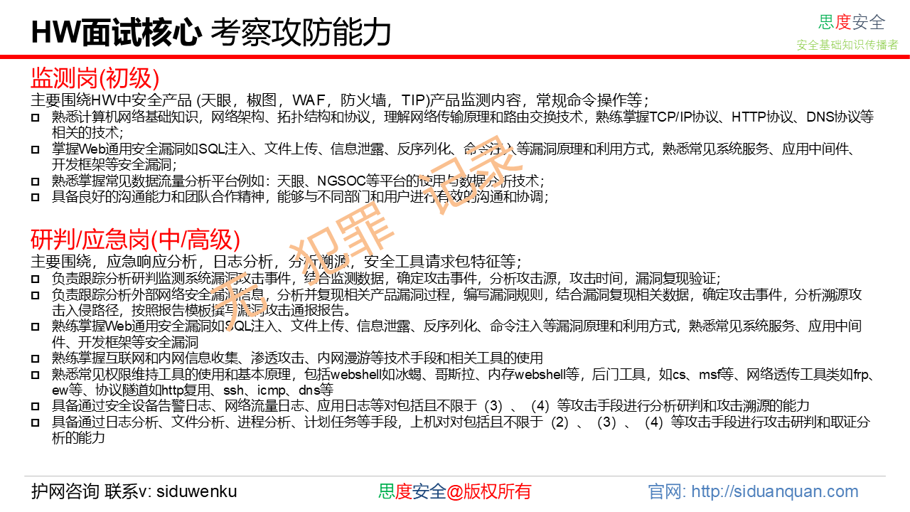 高级岗位:要求具备出色的客户沟通技巧和现场领导能力,能够在护网期间提供问题解决方案,并协助客户处理各类突发网络安全事件。